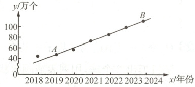 (2)将点$A(2019,45.3)$,$B(2024,104.5)$代入$y=kx+b$,得$\begin{cases}2019k+b=45.3\\2024k+b=104.5\end{cases}$,解得$\begin{cases}k=11.84\\b=-23859.66\end{cases}$,所以直线$AB$的函数表达式$y=11.84x-23859.66$。故$k=11.84$,$k$的实际意义为我国发明专利申请授权数的年平均增长数约为$11.84$万个。当$x=2025$时,$y=11.84×2025-23859.66=116.34$。答:我国2025年发明专利申请授权数约为$116.34$万个。