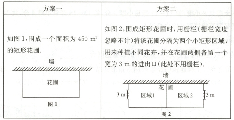 已知花圃一边靠墙(墙的长度不限), 其余部分用总长为$60 \mathrm{~m}$的栅栏围成, 兴趣小组设计了以下两种方案: