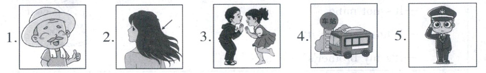 1.farmer 2.long hair 3.play games 4.bus stop 5.police officer