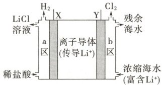 3.D [X极为正极,电极反应式为2H⁺+2e⁻=H₂↑,Y极为负极,电极反应式为2Cl⁻-2e⁻=Cl₂↑。该装置为原电池,可获得电能,产物有LiCl,故A正确;X极为正极,Y极为负极,电子由Y极通过外电路移向X极,故B正确;Y极每生成标准状况下22.4L Cl₂,转移2mol电子,有2mol Li⁺从b区移至a区,没有说明是标准状况,故D错误。]
