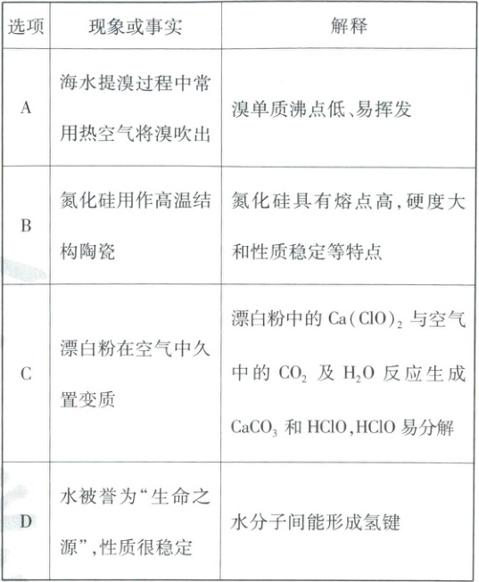 溴单质沸点低、易挥发,故海水提溴过程中常用热空气将溴吹出,A项正确;氮化硅为共价晶体,具有熔点高、硬度大和性质