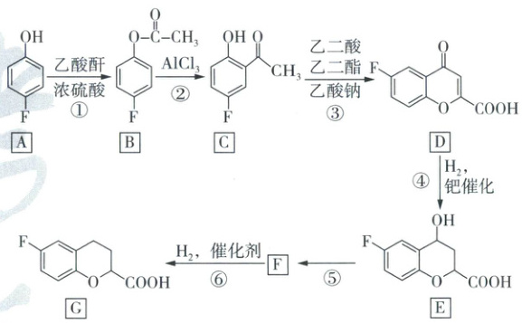 (流程:$A$($HO - 苯环 - F$)$->[乙酸酐][浓硫酸]$$B$(${O - CO - CH_{3} - 苯环 - F}$)${->[AlCl_{3}]}$$C$(${HO - 苯环 - CO - CH_{3} - F}$)$->[乙二酸二乙酯、乙酸钠]$$F$($O - 苯并吡喃 - COOH - F$)${->[H_{2},钯催化]}$$E$($OH - 苯并吡喃 - COOH - F$)$->[?]$$F$(中间产物)${->[H_{2},催化剂]}$$G$($O - 苯并六元环 - COOH - F$))