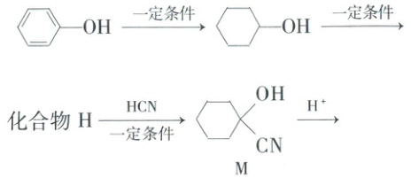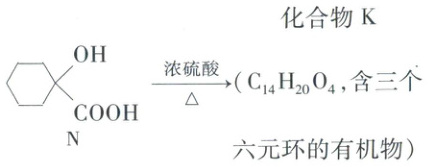 (路线:$OH - 苯环 ->[一定条件] OH - 环己烷 ->[一定条件]$化合物$H ->[HCN][一定条件]$$M$($OH - 环己烷 - CN$)${->[H^{+}]}$$N$($OH - 环己烷 - COOH$)$->[浓硫酸][\Delta]$化合物$K$(${C_{14}H_{20}O_{4}}$,含三个六元环))