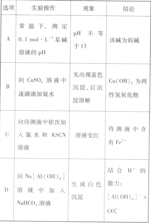 9 D 实验操作、现象和结论分析 向$\mathrm{Na[Al(OH)_4]}$溶液中加入$\mathrm{NaHCO_3}$溶液,发生反应$[\mathrm{Al(OH)_4]^- + HCO_3^- = CO_3^{2-} + Al(OH)_3↓}$,生成$\mathrm{Al(OH)_3}$白色沉淀,故结合$\mathrm{H^+}$的能力:$[\mathrm{Al(OH)_4]^- > CO_3^{2-}}$,D正确。 错误项分析 常温下,$0.1mol· L^{-1}\mathrm{Ba(OH)_2}$溶液中$c(\mathrm{OH^-}) = 0.2mol· L^{-1}$,$c(\mathrm{H^+}) = \frac{K_w}{c(\mathrm{OH^-})} = 5×10^{-14}mol· L^{-1}$,pH = 14 - lg5 ≈ 13.3,故pH不等于13,不能说明该碱为弱碱,A错误;向$\mathrm{CuSO_4}$溶液中逐滴滴加氨水,先生成氢氧化铜蓝色沉淀,当氨水过量时,氢氧化铜与一水合氨发生反应生成$[\mathrm{Cu(NH_3)_4]^{2+}}$使氢氧化铜沉淀溶解,故不能说明$\mathrm{Cu(OH)_2}$为两性氢氧化物,B错误;向含有$\mathrm{Fe^{3+}}$的待测液中依次加入氯水和$\mathrm{KSCN}$溶液,溶液也会变红,故不能根据溶液变红说明待测液中含有$\mathrm{Fe^{2+}}$,C错误。