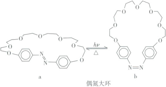 当偶氮大环呈反式结构时,光开关处于关闭态,不能键合碱金属离子;呈顺式结构时,偶氮参与配位,碱金属离子被键合到穴中。