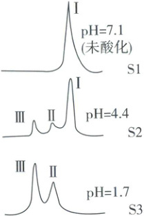 在一定温度下酸化反应达到平衡时, 测定溶液 $ pH$, 并分别取等体积溶液测得 T 中 6 - 位碳原子上 $ H$ 的核磁共振信号(如图, 峰面积与化学环境相同的 $ H$ 原子数成正比), 其中未酸化的溶液 $ S1$ 中仅有信号峰Ⅰ。