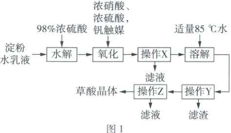 15. (15分)草酸晶体(${H_{2}C_{2}O_{4}· 2H_{2}O}$)是一种重要的还原剂,常温常压下为无色柱状晶体。某实验小组以淀粉为原料制备草酸晶体并测定其纯度,制备实验流程如图1所示,草酸溶解度随温度变化曲线如图2所示。