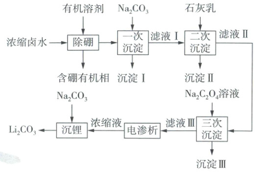 16. (14分)某工厂将盐湖水进行初步除杂浓缩后得到浓缩卤水(含有${Li^{+}}$、${Na^{+}}$、${Ca^{2+}}$、${Mg^{2+}}$、${Cl^{-}}$、硼酸根离子等),利用浓缩卤水制备锂离子电池原料${Li_{2}CO_{3}}$的工艺流程如下: