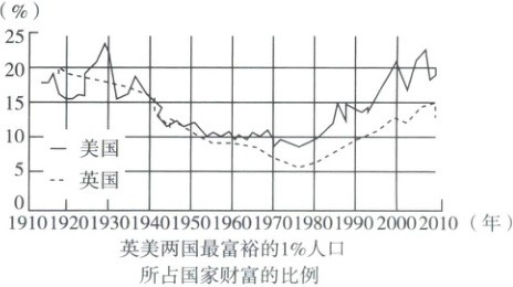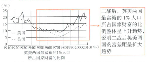 福利国家制度可以通过再分配缩小贫富差距,但从图中可以看出,尽管英美两国在二战后都建立了福利国家制度,但社会贫富分化仍呈扩大趋势,这表明福利国家制度不能从根本上解决贫富分化的问题,C项正确。
