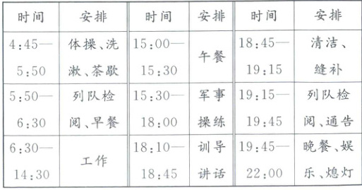 12. 1935年,为应对失业问题,德国设置劳动服务营,18—25岁男性青年须服务半年,下表是该营的作息时间表。此举表明德国