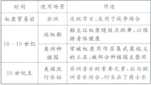 15. 非洲鼓是非洲的一种传统乐器,下表呈现了其功用在近代以来经历的变化。这反映了
