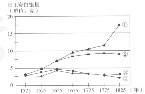 11. 下图中①—④号线是1525—1825年欧洲四个城市工人日工资变化折线,其中②号线代表的是