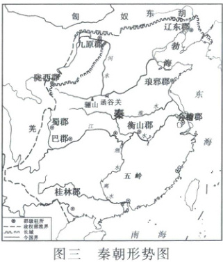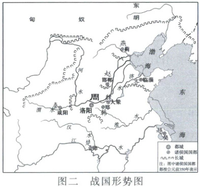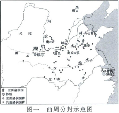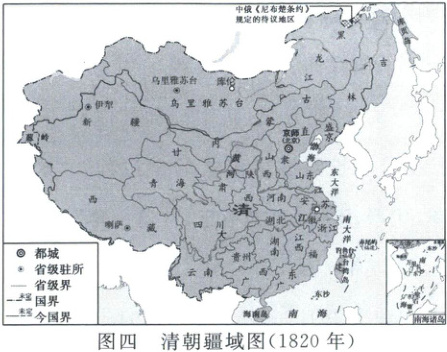 7.B 大一统发展进程 审地图:西周分封示意图中标注的主要诸侯国有晋、卫、宋、鲁、齐、燕、吴,体现了西周的分封制;战国形势图展示了“战国七雄”的分布区域及其都城的地理位置和相对的政治态势;秦朝形势图反映了秦朝疆域及其各郡郡治的情况;清朝疆域图(1820年)中,内地分立18省,反映了清朝实行省、府、县三级行政制度。综上所述,图一至图四体现了从分封天下到郡县天下的大一统发展进程,B项正确。
