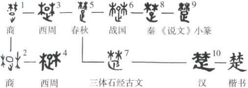 1. 下图为“楚”字演化图。如图所示,楚字诸形之中,中部个别从草,多数从林,草、林同属草木类,作为形符可通用。楚,又被称作荆,为一木之二名,本是一种开蓝紫色小花的灌木,枝条可编织筐篮等器具。用“楚”来做族名和国名,反映了早期楚人