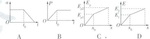 11. 如图所示,倾斜传送带以恒定速率顺时针转动。$t=0$时刻,在底端轻放一小物块,$t_0$时刻物块与传送带共速,位移为$x_0$。物块运动的加速度$a$、摩擦力的功率$P$随时间$t$变化,重力势能$E_p$、机械能$E$随位移$x$变化的关系图线可能正确的是