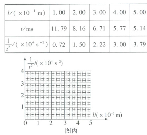 (用题中所给的字母表示)。(4)保持滑块和砝码质量不变,多次改变遮光条到光电门的距离$l$,记录每次遮光条的遮光时间$t$及对应的$\frac{1}{t^2}$,数据见表。请根据表中的数据,在图丙所示的方格纸上作出$\frac{1}{t^2}-l$图像。