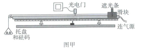 12. ☆(15分)如图甲利用气垫导轨验证“系统机械能守恒”的实验装置。光电门固定在气垫导轨上,遮光条的宽度为$d$,砝码(含托盘)的质量为$M$,滑块(含遮光条)的质量为$m$,重力加速度为$g$。