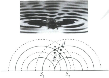 A项分析:根据题图可知a、e两点中每个点到两波源的距离均相等,则a、e连线为两波源连线的中垂线,又c为ae的中点,位于两波源连线的中垂线上,所以α、c、e中每个点到两波源的距离均相等,a、c、e三点为振动加强点,根据题图可知b点到两波源的距离差为半波长[点拨;相邻波峰与波谷之间的距离为个波长],所以b点为振动减弱点,A错误;