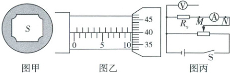 (3) 闭合开关$S$,测出电压表示数$U$、电流表示数$I$,则金属管的中空截面积$S =$