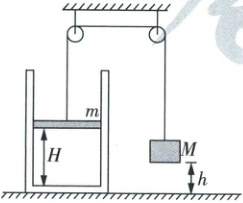 13. (10 分)如图所示,一圆柱形汽缸固定在水平地面上,用质量$m = 2kg$、横截面积$S = 1.0 × 10^2 cm^2$的活塞密封着一定质量的理想气体,跨过光滑定滑轮的轻绳两端分别连接着活塞和一质量$M = 12kg$的重物,左、右两侧的绳均竖直,活塞与汽缸之间的最大静摩擦力与滑动摩擦力相等,均为$f = 30N$。开始时缸内气体的温度为$T = 300K$,压强为$p = 0.9 × 10^5Pa$,活塞与汽缸底部的距离为$H = 50cm$,重物与水平地面的距离为$h = 10cm$。外界大气压为$p_0 = 1.0 × 10^5Pa$,重力加速度$g = 10m/s^2$。现对缸内气体缓慢加热。求: