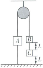 10. 如图所示,物块$A$的质量为$M$,物块$B$和物块$C$的质量均为$m(m \leq M \leq 2m)$并都可看作质点,三个物块用轻细线通过轻质定滑轮连接,$B$与$C$的距离和$C$与地面的距离都是$L$。现将$A$下方的细线剪断,若$A$距滑轮足够远且不计一切阻力,$B$、$C$落地后均不反弹。下列说法正确的是