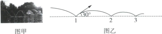 6. ☆图甲是打水漂的图片,石块从水面弹起到触水算一个水漂,若石块每次从水面弹起时速度与水面的夹角均为$30°$,速率损失$25\%$。图乙是石块运动轨迹的示意图,测得石块第 1 次弹起后的滞空时间为$0.8\ s$,已知石块在同一竖直面内运动。当触水速度小于$2\ m/s$时石块就不再弹起,不计空气阻力,重力加速度大小$g$取$10\ m/s^2$。下列说法正确的是