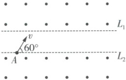 9. 如图所示,在相互平行的边界线$L_1$和$L_2$的上方和下方,均有垂直于纸面向外的匀强磁场,两个区域的磁感应强度大小相同。带正电的粒子从边界$L_2$上的$A$点以初速度$v$与边界线$L_2$成$\theta = 60°$斜向上射出,若第一次从下方磁场穿出时与$L_2$交于$B$点(图中未画出),不计粒子重力。下列说法正确的是