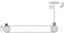 如图所示,水平传送带以$5m/s$的速度顺时针匀速转动,传送带左右两端的距离为$3.6m$。传送带右端正上方有一悬点$O$,用长为$0.3m$、不可伸长的轻绳悬挂一质量为$0.2kg$的小球,小球与传送带上表面平齐但不接触。在$O$点右侧的$P$点固定一钉子,$P$点与$O$点等高。将质量为$0.10kg$的小物块无初速轻放在传送带左端,小物块运动到右端与小球正碰,碰撞时间极短,碰后瞬间小物块的速度大小为$1m/s$、方向水平向左。小球碰后绕$O$点做圆周运动,当轻绳被钉子挡住后,小球继续绕$P$点向上运动。已知小物块与传送带间的动摩擦因数为$0.5$,重力加速度大小$g = 10m/s^2$。