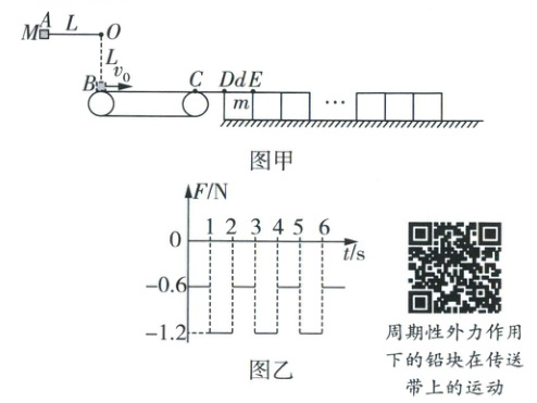15. (14 分)如图甲所示,质量为$M = 1kg$的小铅块,用长度$L = 5m$不可伸长的轻绳悬挂于$O$点,足够长的传送带$BC$水平放置,$B$点在$O$点正下方,$BO = L$,初始将铅块拉至与$O$点等高的$A$点由静止释放,当其第一次摆至$B$点时轻绳刚好被拉断,随后铅块以水平速度$v_0$滑上传送带。$CD$段是一个与传送带等高接触但不影响其转动的光滑平台,平台右侧并排放有 10 个完全相同的木块,其上表面与平台等高。每个木块的质量为$m = 0.5kg$,$DE$长为$d = 0.50m$,铅块与木块上表面之间的动摩擦因数为$\mu_1 = 0.2$,铅块与传送带之间和木块与地面之间的动摩擦因数均为$\mu_2 = 0.1$,不考虑铅块的大小,不计空气阻力。重力加速度$g = 10m/s^2$。最大静摩擦力等于滑动摩擦力。