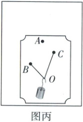 (3) 小红用图丙方案进行实验, 主要器材是两根完全相同的橡皮筋 (遵循胡克定律) 和质量未知的重物。在黑板上实验时, 先用一根橡皮筋拉重物, 记下橡皮筋与重物的结点位置$O$、橡皮筋另一端点位置$A$; 再用两根橡皮筋拉重物, 使橡皮筋与重物的结点仍在位置$O$, 记下橡皮筋另外两个端点的位置$B$和$C$。