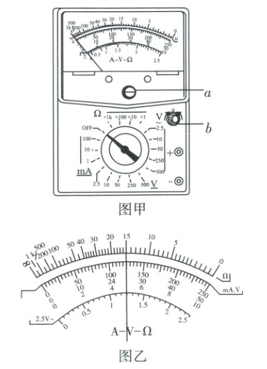 (1) 将电表的选择开关旋至 “×10” 挡, 然后将红黑表笔短接, 通过调节图甲中的 (选填 “$a$” 或 “$b$”), 让指针指在表盘右侧 “$0\ \Omega$” 处。接着用该表测量一个电阻的阻值, 测量时指针位置如图乙所示, 则该电阻的测量值为 $\Omega$。随后又用此挡位去测量另一个电阻, 发现指针偏转角度过大, 为了较准确地进行测量, 接下来的合理操作步骤是