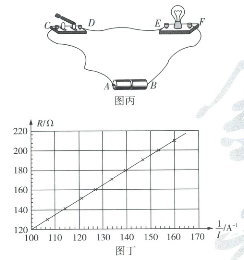 (3)根据题意可知测量多用电表“×1”挡内部电源电动势的电路图如图所示,由闭合电路欧姆定律有$E = I(R + R_{mA} + r)$,变形得$R = E · \frac{1}{I} - R_{mA} - r$,则$R - \frac{1}{I}$图像的斜率$k$表示多用电表“×1”挡内部电源的电动势,由题图丁可知图像斜率为$E = \frac{180 - 120}{140 - 100}V = 1.5V$,将$(100A^{-1}, 120\Omega)$代入$R = E · \frac{1}{I} - R_{mA} - r$,解得$R_{mA} = 15\Omega$。