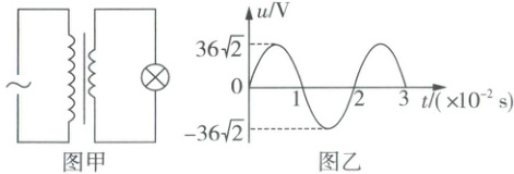 2. 图甲所示的理想变压器原线圈接入图乙所示的正弦式交流电,副线圈接一个规格为“6 V,3 W”的灯泡。灯泡正常工作,则理想变压器原、副线圈的匝数比为