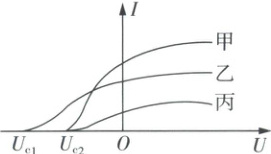 1.A 光电效应现象+(I - U 图像) 由爱因斯坦光电效应方程可知$E_{km} = h\nu - W_0$,又$E_{km} = e|U_c|$【点拨:该关系式是由动能定理得出的,加遏止电压时电场力对逸出的光电子做负功,使阴极发射的初动能最大的光电子刚好到达不了阳极,即$|eU_c| = E_{km}$】且做光电效应实验时用同一光电管,金属的逸出功$W_0$一定(相同),由题图可知$|U_{c1}| > |U_{c2}|$,所以$\nu_Z > \nu_甲 = \nu_丙$,A 正确,BCD 错误。