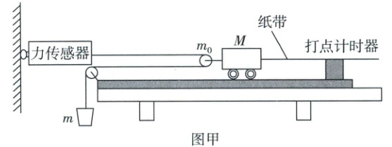 12. (9 分)如图甲所示,孙华和刘刚两位同学合作设计了一套研究小车加速度与力关系的实验装置。已知小车的质量 $M$ 一定,砂和砂桶的总质量为 $m$,打点计时器所接交流电源的频率为 $50$ Hz,小车的前端用一根轻质短杆固定着质量为 $m_0$ 的光滑滑轮。