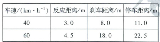 (2)由题表中的数据可知车速为40 km/h时,刹车距离为$x_3 = 8.0$ m,则由匀变速直线运动公式$v_{01}^2 = 2ax_3$得该车刹车的加速度大小为$a = \frac{v_{01}^2}{2x_3} = \frac{625}{81}$ m/s² ………………………… (2分)