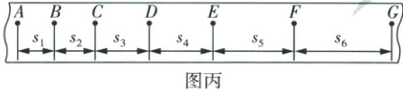 (4)刘刚同学实验中测得,拉力传感器的示数为 $4.00$ N,打出的部分计数点如图丙所示(每相邻两个计数点间还有 4 个点未画出),其中 $s_1 = 4.79$ cm,$s_2 = 5.61$ cm,$s_3 = 6.39$ cm,$s_4 = 7.17$ cm,$s_5 = 7.98$ cm,$s_6 = 8.84$ cm,则小车的加速度 $a =$