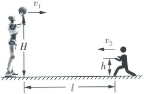 4. ☆如图所示,人形机器人陪伴小孩玩接球游戏。机器人在高度为$H$的固定点以速率$v_1$水平向右抛球,小孩以速率$v_2$水平向左匀速运动,接球时手掌离地面高度为$h$。当小孩与机器人水平距离为$l$时,机器人将小球抛出。忽略空气阻力,重力加速度为$g$。若小孩能接到球,则$v_1$为