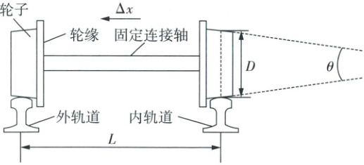 7. ☆为避免火车在水平面上过弯时因内外轨道半径不同致使轮子打滑造成危险(不考虑离心问题),把固定连接为一体的两轮设计成锥顶角$\theta$很小的圆台形,如图所示。设铁轨间距为$L$,正常直线行驶时两轮与铁轨接触处的直径均为$D$,过弯时内外轨间中点位置到轨道圆心的距离为过弯半径$R$。在$\theta$很小时,$\tan\theta\approx\sin\theta\approx\theta$。若在水平轨道过弯时要求轮子不打滑且横向偏移量不超过$\Delta x$,则最小过弯半径$R$为