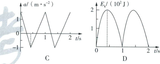 错误项分析 由B项分析可知0~0.4s内龙舟的加速度是不变的,0.6~1.0s内龙舟的加速度也是不变的,C错误;0~0.4s内龙舟相对无人机的动能$E_k = \frac{1}{2}mv^2 = \frac{1}{2}m(at)^2$,可知0~0.4s内$E_k - t$图像为开口向上的抛物线的一部分,D错误。