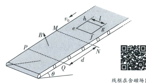 线框运动情况分析:在$ef$边进入磁场而$gh$未进入磁场的过程中,线框受到沿传送带平面向上的安培力$BIl$和沿传送带平面向下的重力分力$mgsin\theta$,若线框相对传送带滑动,则滑动摩擦力为$\mu mgcos\theta$,而$\mu = tan\theta$,故$\mu mgcos\theta = mgsin\theta$,由题意若线框$ef$边或$gh$边受到安培力,则其安培力大于$2mgsin\theta$,即线框受到的安培力$BIl > 2mgsin\theta$,即$BIl > mgsin\theta + \mu mgcos\theta$,又最大静摩擦力等于滑动摩擦力,因此线框将相对传送带向上滑动,滑动摩擦力方向沿传送带平面向下,线框在沿传送带平面的安培力、重力分力、摩擦力作用下做减速运动;在$gh$边进入磁场到$ef$边离开磁场的过程中,因线框速度小于传送带速度,故其所受滑动摩擦力方向沿传送带平面向下,又因该过程穿过线框的磁通量不变,线框不受安培力,所以其在沿传送带平面向下的滑动摩擦力和重力分力作用下做匀加速直线运动;由于线框$ef$刚进入磁场时的速率为$v_0$,刚离开磁场时的速率也为$v_0$,所以对比从$ef$边进入磁场到$gh$边进入磁场的过程和从$ef$边离开磁场到$gh$边离开磁场的过程可知,两个过程线框的运动情况相同。