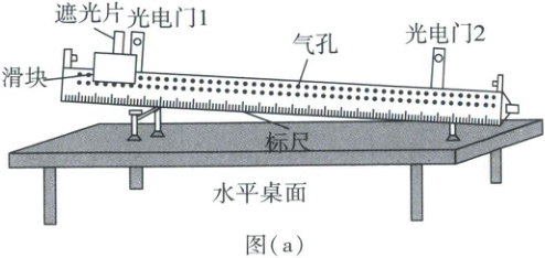 11. (8分)某小组利用气垫导轨、两个光电门、滑块、遮光片等,组成具有一定倾角的导轨装置,研究机械能守恒定律。重力加速度$g$取9.80 m/s²。