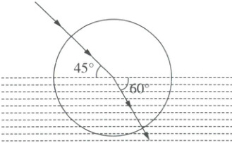 13. (10分)一透明的开口球壳形容器,一半浸入水中,一半暴露于空气中,球壳内液面与球壳外液面平齐,截面图如图所示。现有一束激光从球壳上方斜向下与水面成45°角射向球心,发现水面下的光线与水面成60°角。