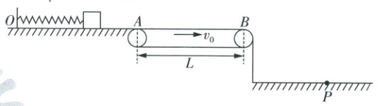 14. (16 分)某种弹射装置如图所示,左端固定的轻弹簧处于压缩状态且锁定,弹簧具有的弹性势能$E_p = 18\ J$,质量$m = 1\ kg$的小滑块静止于弹簧右端,光滑水平导轨$OA$的右端与水平传送带平滑连接,传送带长度$L = 10\ m$,传送带以恒定速率$v_0 = 10\ m/s$顺时针转动。某时刻解除锁定,滑块被弹簧弹射后滑上传送带,并从传送带右端水平滑离落至地面$P$点。已知滑块到达$A$点前已经离开弹簧,滑块与传送带之间的动摩擦因数$\mu = 0.4$,不计空气阻力,重力加速度大小$g$取$10\ m/s^2$。