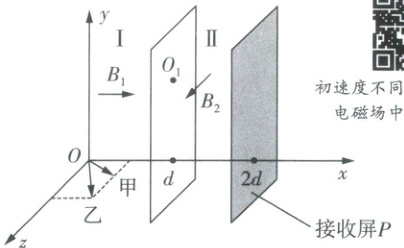 13. 某粒子分析器的部分电磁场简化模型如图所示,三维直角坐标系$O − xyz$所在空间中Ⅰ区域($0\leq x\leq d$)存在沿$x$轴正方向的匀强电场(图中未画出)和匀强磁场,磁感应强度大小为$B_1$,Ⅱ区域($d < x\leq 2d$)存在沿$z$轴正方向的匀强磁场,磁感应强度大小为$B_2$,在$x = 2d$处有一足够大的接收屏$P$。原点$O$处的粒子源在$xOz$平面内同时发射带正电的同种粒子甲和乙,甲粒子速度大小为$v_0$,与$x$轴正方向夹角为$30^{\circ}$,乙粒子速度方向与$x$轴正方向夹角为$60^{\circ}$,两粒子沿$x$轴方向速度分量相等。乙粒子以最短时间到达$O_1(d,d,0)$点,进入Ⅱ区域后恰好到达接收屏并被吸收。不计重力及粒子间的相互作用,则