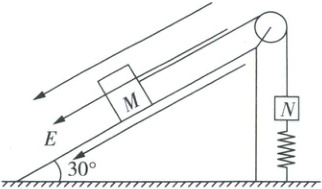 12. 如图,足够长的绝缘斜面固定在水平地面上,倾角为$30^{\circ}$,空间有一电场强度大小为$E =\frac{3mg}{2q}$,方向沿斜面向下的匀强电场。质量均为$m$的物块$M$和$N$用绝缘轻绳跨过轻质定滑轮连接,$M$带正电,电荷量为$q$,$N$不带电,并与固定在地面上的竖直轻弹簧连接,弹簧劲度系数为$k$,通过外力控制$M$使轻绳伸直且无拉力,已知重力加速度大小为$g$,不计摩擦,弹簧始终在弹性限度内。现由静止释放$M$,$M$第一次下滑到最低点所用时间为$t$,在此过程中下列说法正确的是