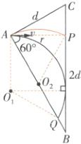 答案:$\frac{\sqrt{3}}{2}d$ 点拨:BC边有粒子射出的区域为从P点到$\theta = 60^{\circ}$时轨迹与BC的切点,即长度为$r=\frac{\sqrt{3}}{2}d$。