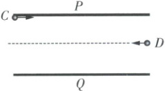 7. 如图所示,平行金属板$P$、$Q$间存在匀强电场(不考虑边界效应),间距为$2d$,板长为$4d$。$t=0$时刻从上板左边缘$C$处水平向右射入质量为$m$、电荷量为$q$的粒子,在两板正中间最右侧的$D$点同时水平向左射入质量也为$m$、不带电的粒子。两粒子射入电场时的初始动能均为$E_{\rm k}$,相遇时发生完全非弹性碰撞,碰撞时间极短。不计重力,碰撞过程电荷量保持不变,则