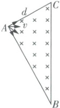 8. 如图所示,在$\triangle ABC$区域内(含边界)存在垂直于三角形平面向里的匀强磁场,$\angle A = 90^{\circ}$,$AC = d$,$BC = 2d$。在顶点$A$处有一粒子源,可以在垂直磁场的平面内,向$\angle CAB$区域内各个方向均匀射入比荷为$k$、速率为$v$的带负电的粒子,有$\frac{2}{3}$的粒子能从$AB$边射出,忽略粒子的重力及相互间的作用力。下列说法中正确的是