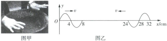 9. 如图甲所示,鱼洗是我国古代一种盥洗用具,具有很高的科学价值、历史价值和艺术价值。有节奏地摩擦鱼洗双耳,振动产生的两列波相向传播,在水面上叠加,可以看到盆内水波荡漾,甚至喷出水柱。现以鱼洗其中一耳所在位置为坐标原点,以双耳连线为$x$轴、竖直向上为$y$轴建立平面直角坐标系,两耳(波源)位置的横坐标分别为$x_1 = 0$、$x_2 = 32 \mathrm{cm}$已知两耳的振动频率均为 5 Hz,发出两列沿$x$轴方向相向传播的波,某时刻波形图如图乙所示,下列说法正确的是